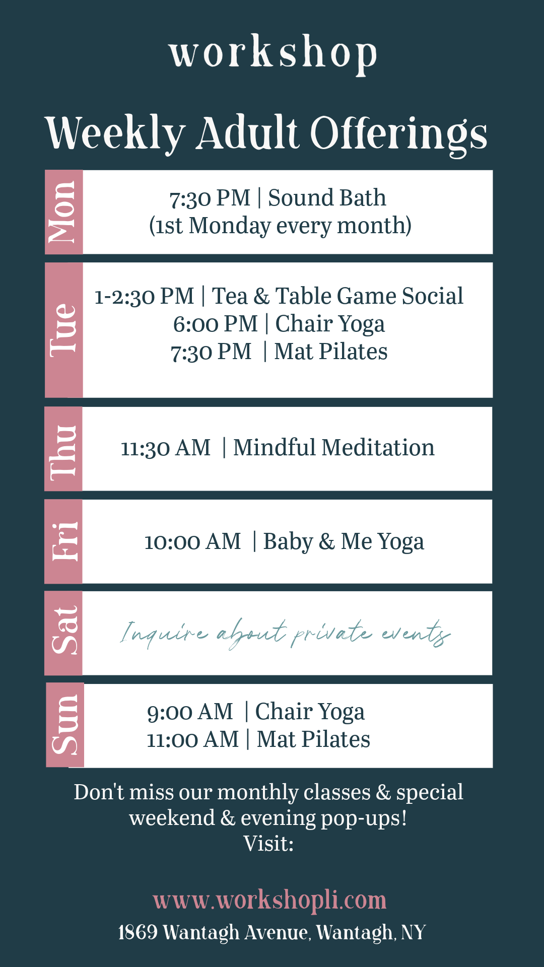 These workshops rotate monthly and feature trusted practitioners from our community, offering experiences that blend wellness, creativity, and connection.